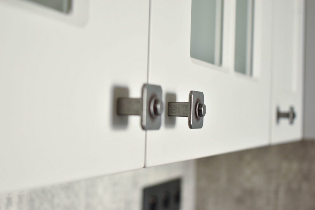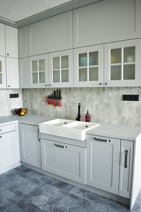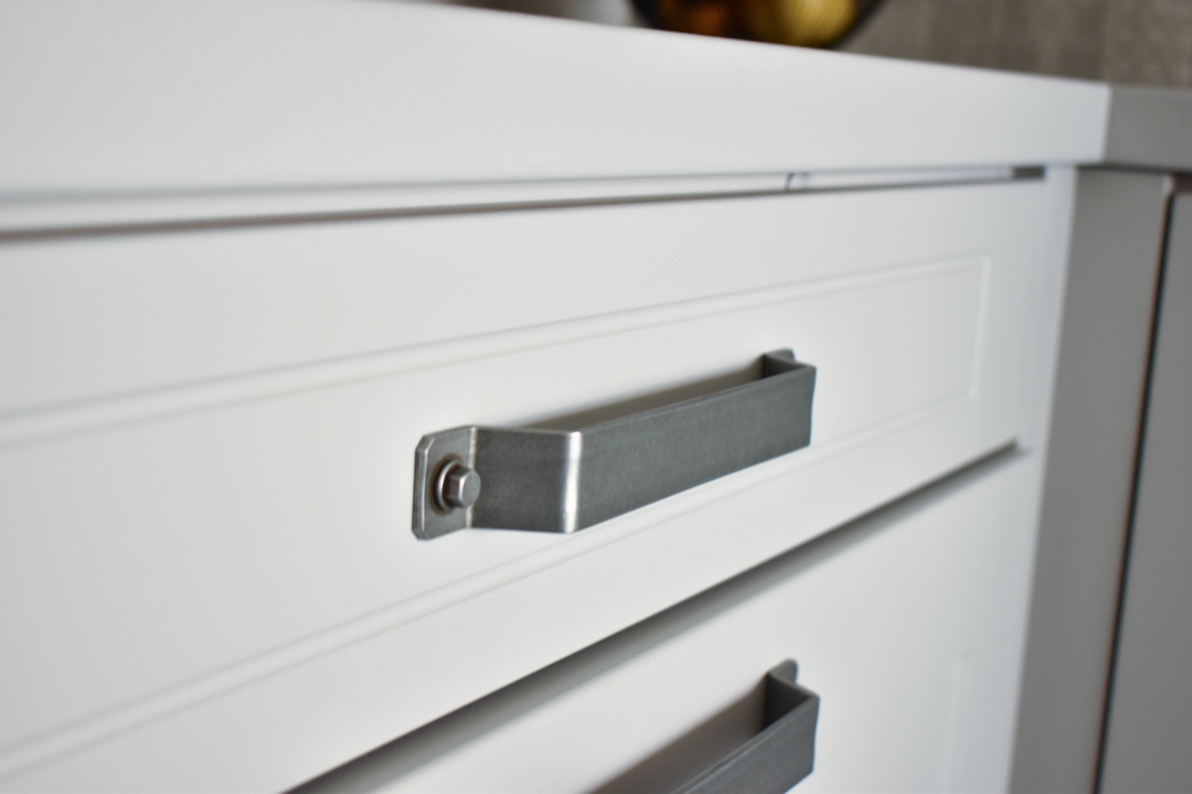 Fóliovaná dvířka kuchyně jsou model D76 v odstínu Perleťově šedá – supermatná a využívají úchytky Kentucky.