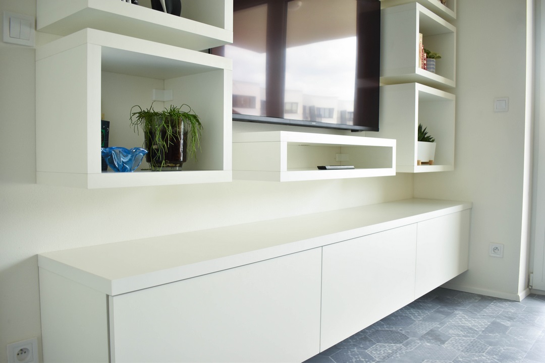 Obývací pokoj jsme vybavili moderní závěsnou televizní stěnou s použitím materiálu DTDL 8100 SM zářivá bílá hladká. Skládá se ze závěsné skříňky se třemi zásuvkami s bezúchytkovým TipOn otevíráním, pouhým stisknutím se tak dostanete ke všemu, co jste si uložili.