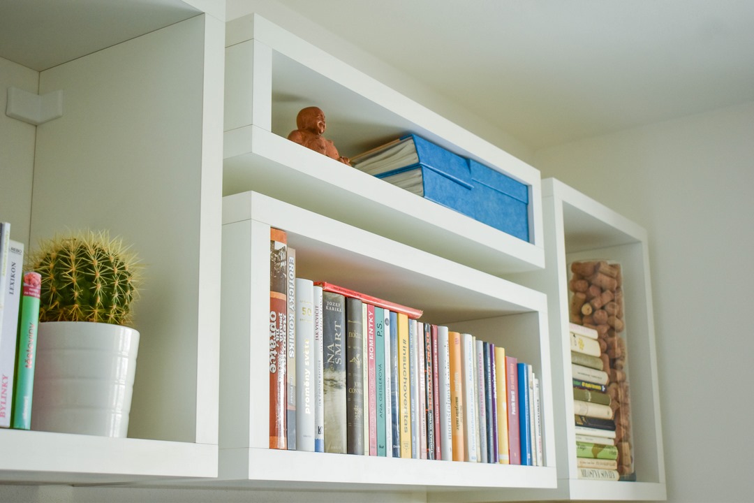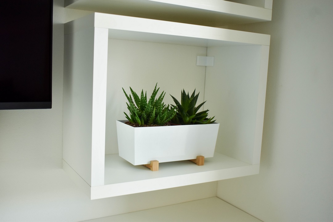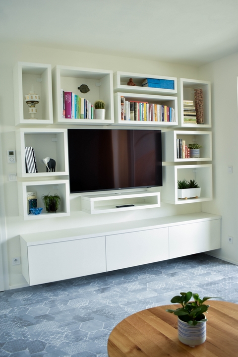 Skříňku doplňují hranaté závěsné police ve stejném materiálu. Police jsou různých rozměrů a poskládány, aby obývací stěna působila zajímavě a netradičně. Jsou uzpůsobeny tomu nést dekorace, lampy i knihy a přímo pod televizí najdeme úzkou polici vhodnou na odložení ovladače popř. I na umístění herní konzole či přehrávače.