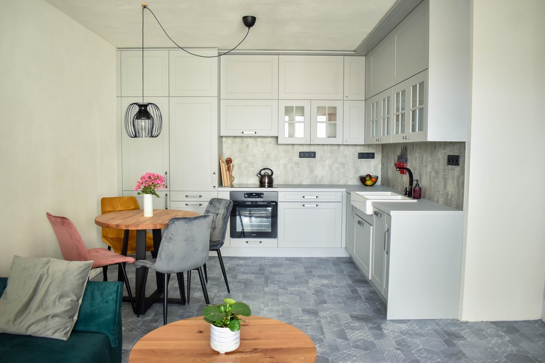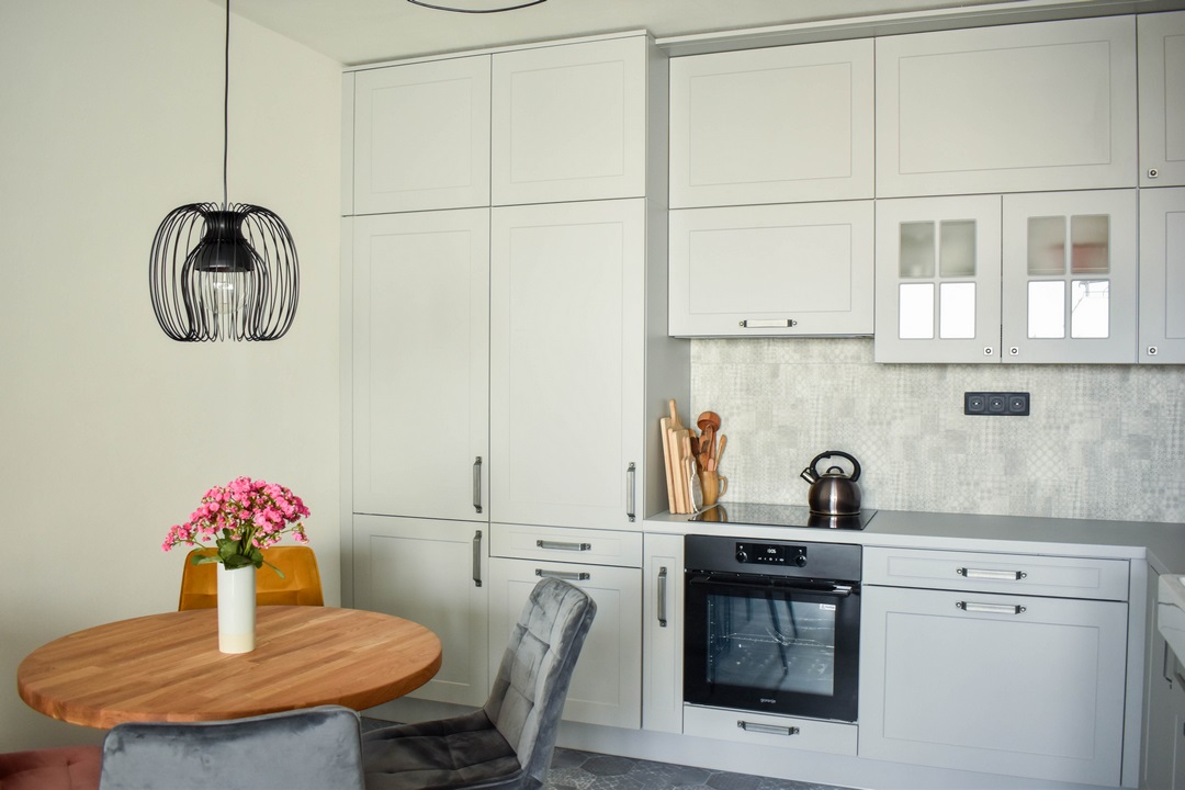 Začněme tedy od začátku a to konkrétně v kuchyni. Na přání klientky se kuchyňská linka táhne až ke stropu a dává tak mnohem více úložného prostoru. Navíc místnost opticky protáhne a to se v menším prostoru vždy hodí.
