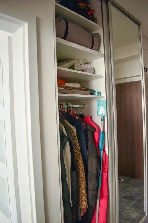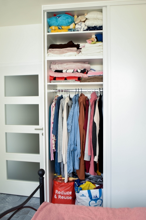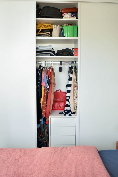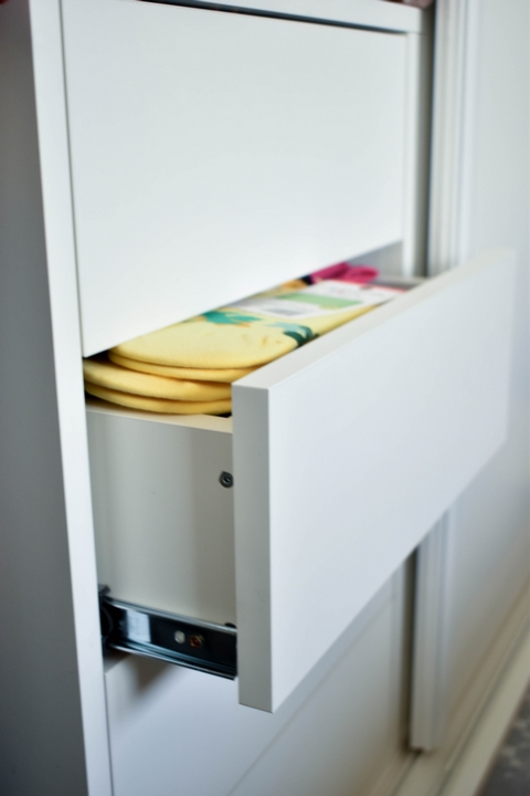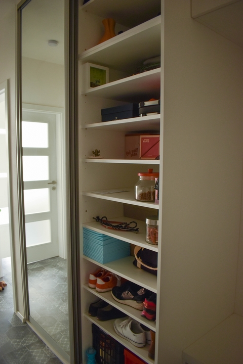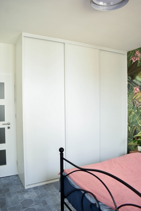 Pojďme se spolu podívat na realizaci hned dvou vestavěných skříní. Jedna z nich byla určena jako hlavní šatní skříň v ložnici. Jedná se o třídveřovou šatní skříň s posuvnými dveřmi. V horní části najdeme policový systém o třech patrech a spodní část je řešena šatní tyčí a vestavěnými zásuvkami v prostředním dílu.