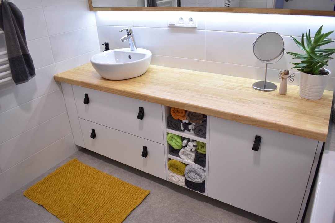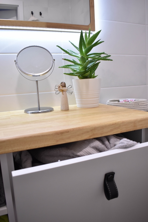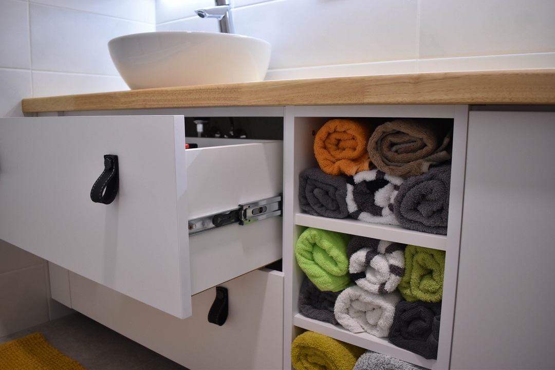 Skříňka je řešena dvěma hlubokými zásuvkami, policovými díly na ručníky a praktickým výklopným košem na prádlo.