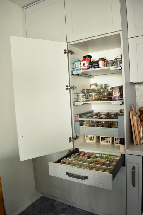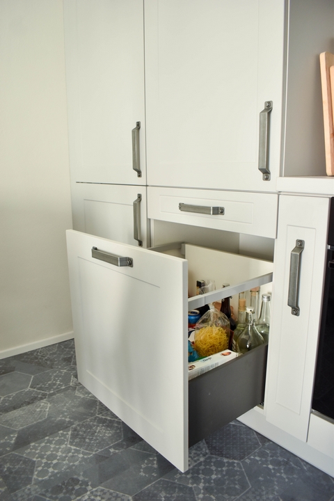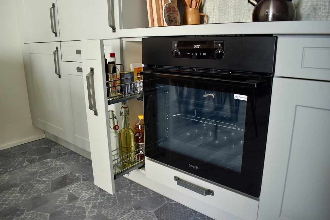 Kuchyň je kombinována z mnoha různých typů úložného prostoru a to ať už se jedná o klasické skříňky a zásuvky, úzké výsuvné skříňky, prosklené i uzavřené a do celé kuchyně je také zabudovaná vestavěná lednice. Vedle lednice najdeme prostornou spižírnu s policemi s praktickou zábranou, aby produkty při manipulaci produkty nevypadly, pod policemi pak najdeme zásuvku na koření a hluboký šuplík využitý v tomto konkrétním případě na lahve a oleje, ale skvěle se hodí například i na hrnce či mísy.